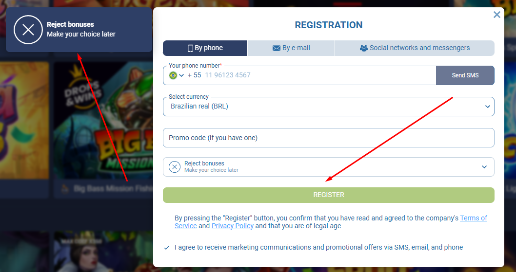 No bonuses or free spins will be credited to your account until both your email address and phone number are fully confirmed.