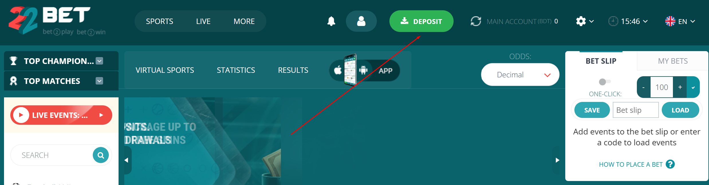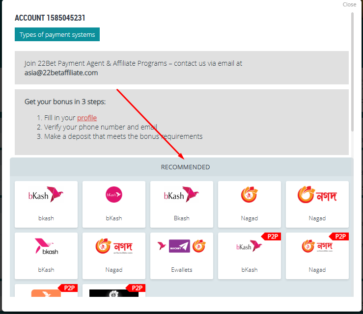 The name on any payment method used must match the name registered in the 22bet profile. Using a card or e-wallet belonging to another person is prohibited and results in the cancellation of winnings and account closure.