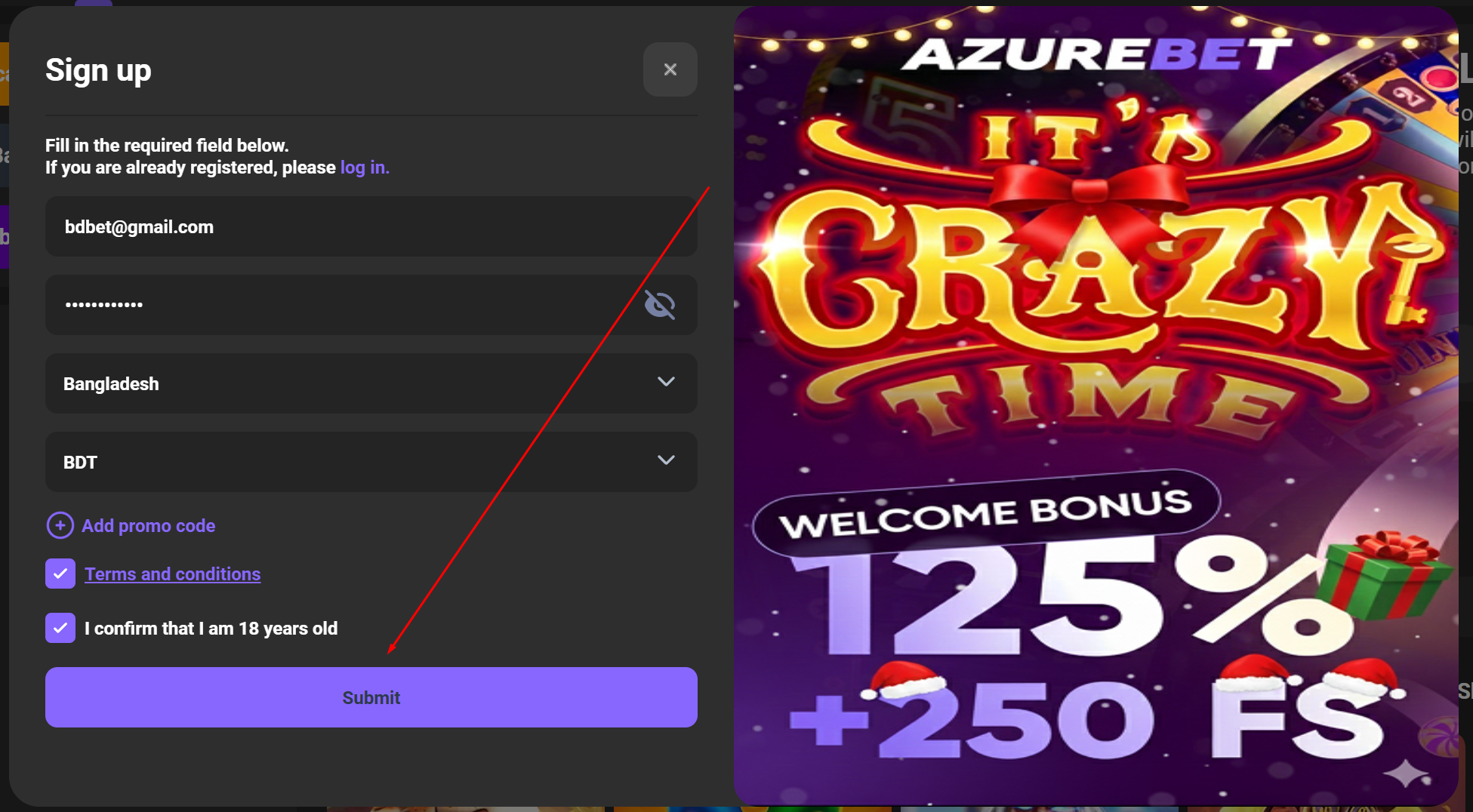 I checked the registration form; an azurebet promo code can be added during signup. I noticed a catch: to get the 125% welcome bonus, you must deposit between 400 ৳ and 25,000 ৳ within one hour of account creation.