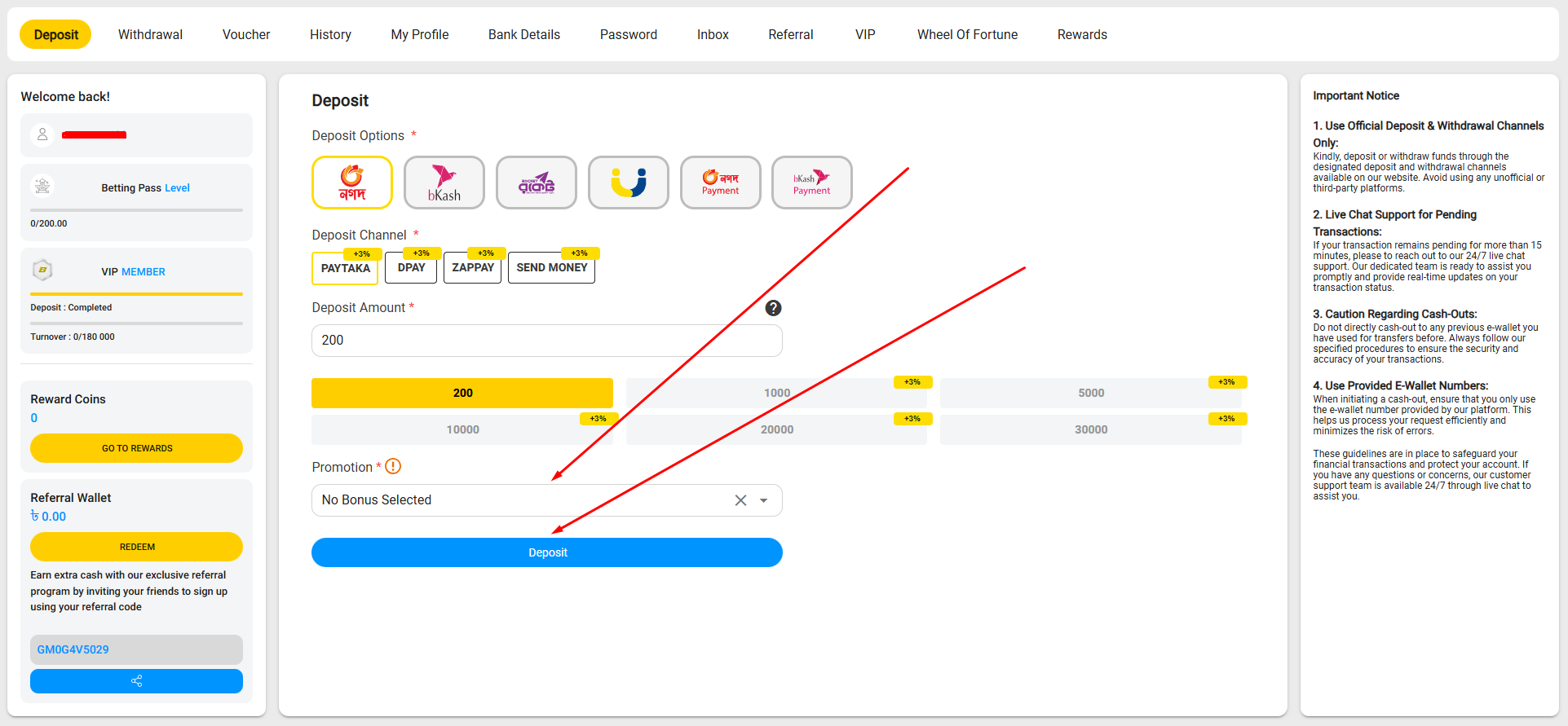 You can fund your account using bKash, Nagad, or Rocket with a ৳200 minimum. In my experience, these deposits are verified within 15 minutes. Most local methods also trigger an automatic 3% to 5% deposit bonus.