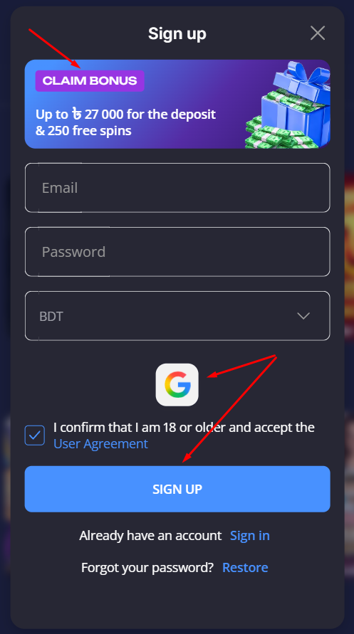 I confirmed the site operates under Curacao license 157065 (Bettor IO N.V.). To log in, use your registered email. Note that while they accept Bangladeshi players via bKash and Nagad, the platform is offshore and unregulated locally.