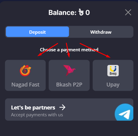Local 300 BDT minimum deposit through Nagad, Bkash, and Upay. -