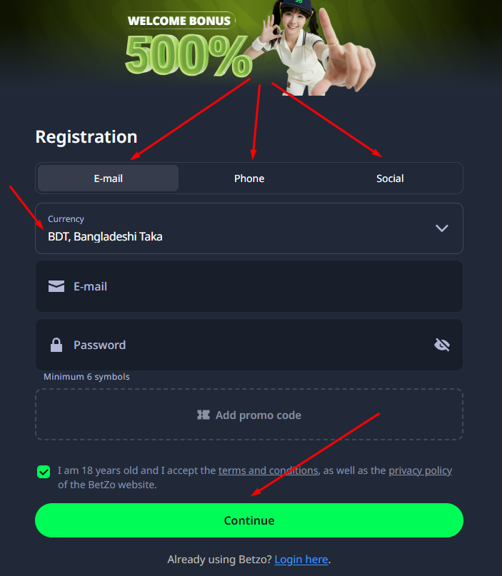 You can enter a Betzo promo code during signup, though the 500% package usually activates automatically with a 420 BDT deposit. Be warned: my analysis shows a strict 3-day deadline to clear the x10-x15 wagering requirement.