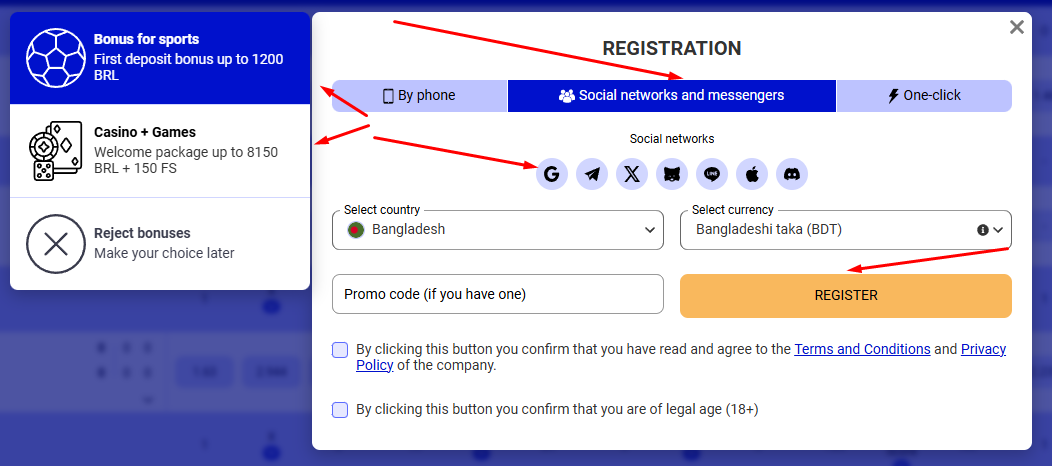 Visit the official website and choose from four flexible methods: One-Click, Phone, Email, or Social Networks. Registration takes as little as 10 seconds with the One-Click option. Sign up now to start betting instantly!